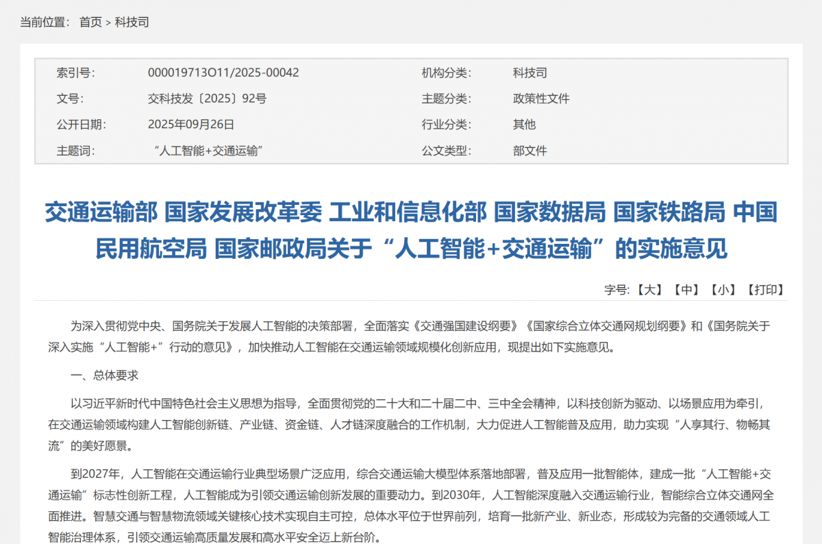 近日,交通运输部、国家发展改革委、工业和信息化部、国家数据局、国家铁路局、中国民用航空局、国家邮政局七部门联合印发《关于“人工智能+交通运输”的实施意见》(简称《意见》)。